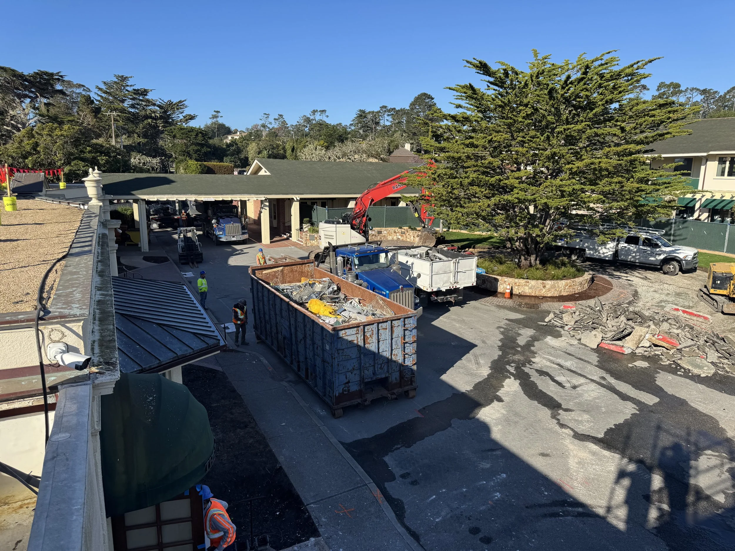 Randazzo Enterprises, Inc. performed comprehensive selective demolition services for the Pebble Beach Lodge renovation project. The scope included full removal of the existing roof system and chimney structures, followed by a complete interior gut down to the studs to prepare the building for reconstruction. Work also involved the removal of outdated HVAC ducting, A/C units, and heating systems to accommodate new mechanical installations. Exterior demolition included terrace stair removal, deck removal, and full stucco removal to expose underlying structural elements. Portions of the concrete foundations and walls were removed to allow for new structural upgrades. The project was completed on time and on budget with no injuries.